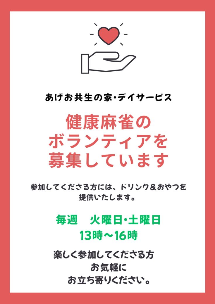 こんにちは!本日はデイサービスで行っている健康麻雀のボランティア様の募集についてアナウンスさせて頂きます。