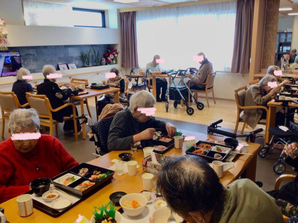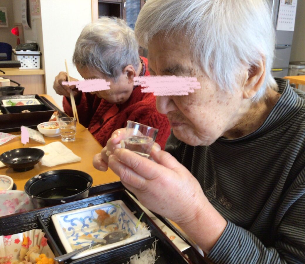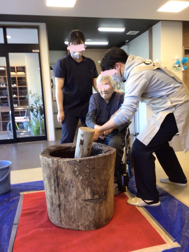 後半の写真は、サービス付き高齢者向け住宅にて、毎年恒例である元旦のおせち料理や祝い酒を召し上がっている様子や、デイサービスにて好評頂き開催しているお餅つきの様子です。